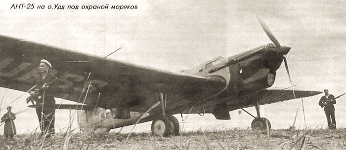 Испытания самолеты успешно прошли в мае 1924 года. С 11 июня того же года АНТ-2 уже перевозил пассажиров. Однако из-за нехватки материалов и трудностей с получением двигателей АНТ-2 так и не достиг стадии серийного производства. Образцы были переданы в Монинский музей авиации. АНТ-25 (другое название самолета РД - "рекорд дальности") разработан в 1932 году в ЦАГИ бригадой Павла Осиповича Сухого под руководством Андрея Николаевича Туполева. 22 июня 1933 года состоялся первый полет. На этом самолёте было совершено несколько рекордных полётов. В сентябре 1934 года экипаж под командованием Михаила Михайловича Громова пролетел по кольцевому маршруту 12411 км за 75 часов. В июле 1936 года на АНТ-25 экипаж Чкалова совершил первый беспосадочный перелёт из Москвы на Дальний Восток. В июне-июле 1937 года экипажи Громова и Чкалова на АНТ-25 и АНТ-25-1 совершили один за другим полёты по маршруту Москва - Северный полюс - Сан-Джосинто (США). На фото ниже вынужденная посадка на о. Удд (ныне о. Чкалова) АНТ- 25 во время перелёт от Москвы до Петропавловска-Камчатского.