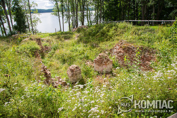 От пристани по каменной лестнице мы проходим через ворота церкви Нила Столобенского. С момента постройки церковь несколько раз перестраивалась. В нынешнем виде - в стиле барокко - Нильская церковь сохранилась с конца 1830-х годов. Отсюда и украшения фасада: лопатки, наличники с белокаменными картушами над окнами, здесь же вставки из поливных изразцов.