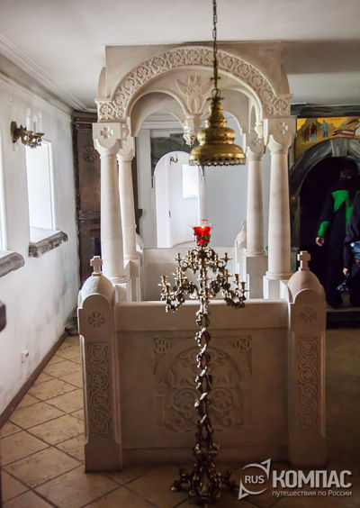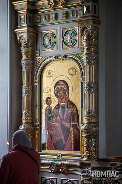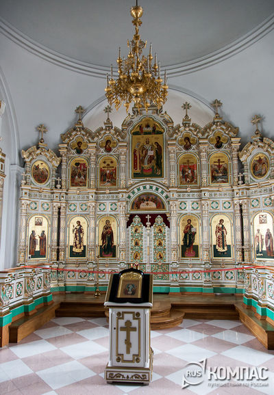 Оказавшаяся поблизости женщина с удивлением на нас посмотрела: "А вы почему в храм не идете? Идите скорее, пока там группа". Натянула я дежурную юбку до пят, поправила платок, поблагодарила советчицу и пошли в храм. Само строение храма двухэтажное, и по замыслу архитектора верхний храм Воскресения Господня и нижний во имя святого апостола Андрея Первозванного контрастируют друг с другом. В верхнем праздничном храме удивительный трехъярусный иконостас – он из белого фаянса, изготовленный на предприятии "Фарфор Сысерти" по образцу исторического деревянного.