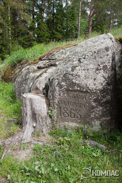 На обочине лесной просеки, ведущей в сторону монастырской фермы, лежит валун, с выбитой на нем датой постройки дороги.