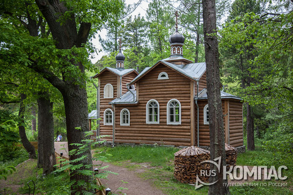 Прошли сотню метров, и мы уже у ворот Воскресенского скита. На территорию скита можно беспрепятственно пройти, посмотреть на церковь и хозяйственные постройки, но только снаружи. Внутрь храма пускают только организованные группы паломников. Поэтому, пройдя по двору, мы, не рассчитывали попасть внутрь церкви, спокойно сели на лавочку передохнуть, чтобы идти дальше.